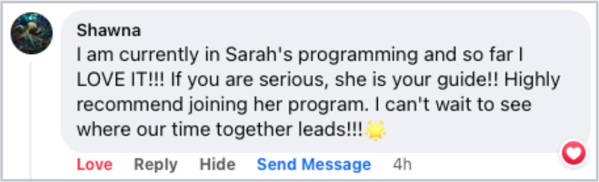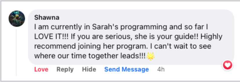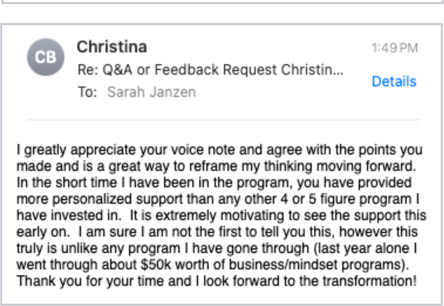 What would I say to another woman considering working with Sarah? It’s an investment in you, and it’s money well invested. The value you get out of the program from Sarah’s videos, 1×1 calls, quick responses with feedback and the ability to connect with other women like you, the program is a steal.
