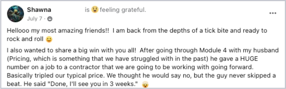 I work in higher education, in a job I don’t love. My husband had a temporarily closed wood shop that I knew we could turn back into the shop of our dreams if we started it together. The challenge was getting my husband on board and starting again, but instituting different ideas. I knew I really wanted to get this back up off the ground for both of us so we could be more financially free, enjoy our job working together, creating, and making homeowners happy. We just didn’t know how to get there. Then I found Sarah. One short 15 minute video changed literally everything.