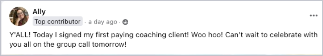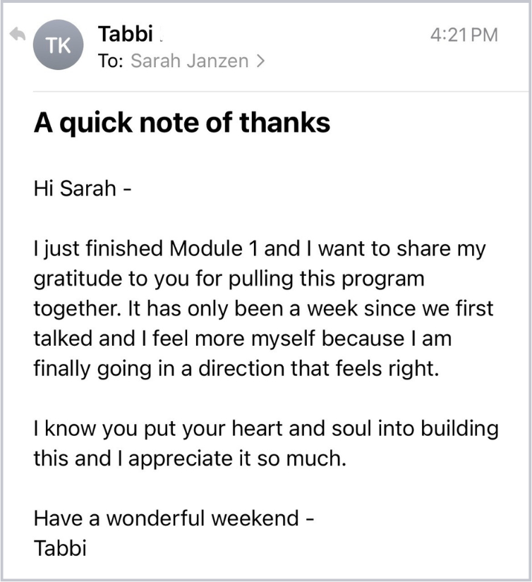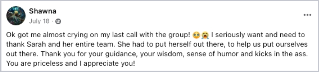 “I’m getting teary eyed just typing this but our call was so powerful and productive for me. I can’t thank you enough for your coaching and suggestions!”