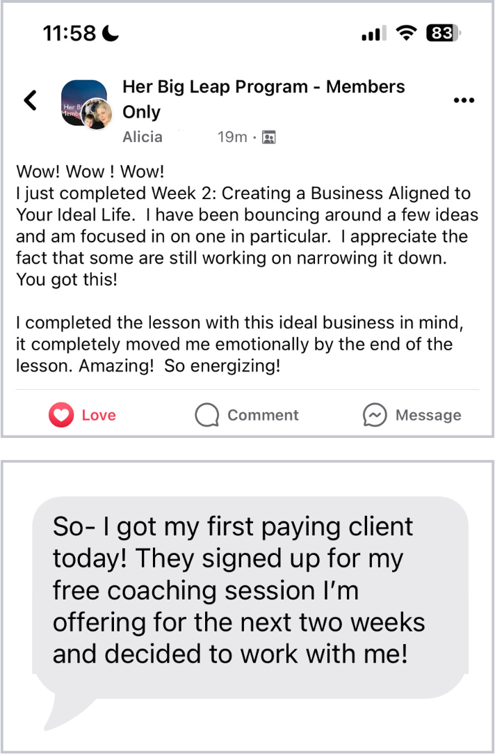 If you could be a fly on the wall during one of our weekly calls, you wouldn’t hesitate one second to sign up for this. The program will change your life in ways that you have no idea. You might even end it, in a totally different place than you started. Within the first 2 weeks, you will go from nervous, and wondering if you did the right thing, to starting to really find your true self, your self worth and your self love and knowing that you are doing absolutely the right thing. That will turn into you becoming one amazing self sufficient woman doing what she loves and making money doing it!