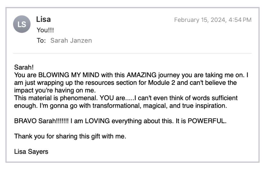 "I’m feeling so good about this. Thank you SO MUCH for all of your care, attention and support. It’s a bit of a process and I’m recognizing how little clarity I had around what I’m hoping to achieve. Your help has been so instrumental and I’m now starting to see where this is going and am learning more and more about how to communicate it. Many many thanks.